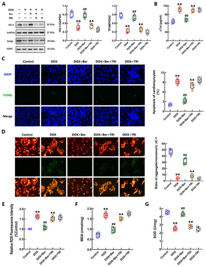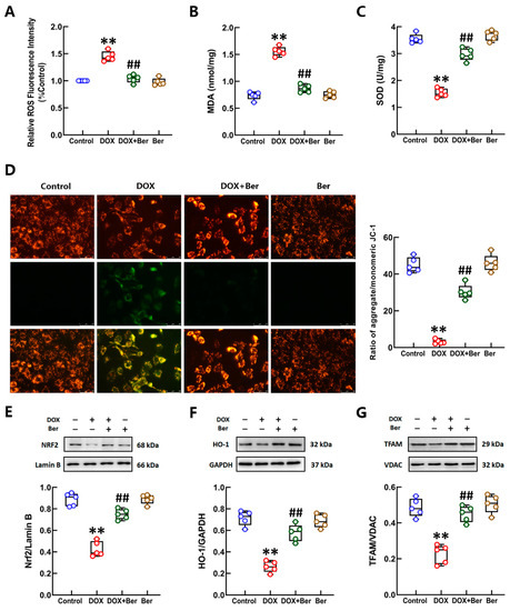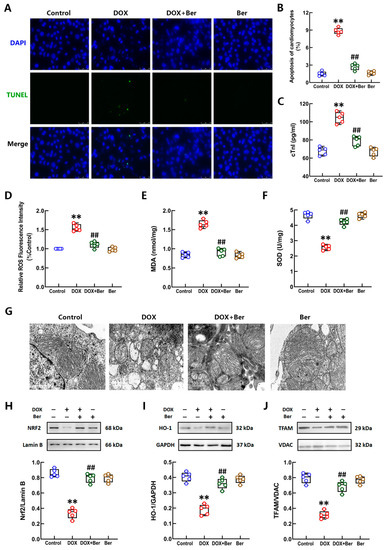 2.2. Ber Inhibited Cardiomyocyte Apoptosis, Oxidative Stress, Mitochondrial Injury and Activated Nrf-2-Mediated Signaling Pathway in Cardiomyocytes after DOX Stimulation