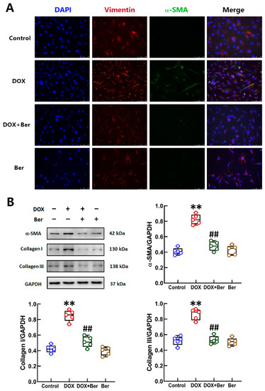 2.4. Ber Suppressed DOX-Induced Differentiation of Cardiac Fibroblasts (CFs) into Myofibroblasts