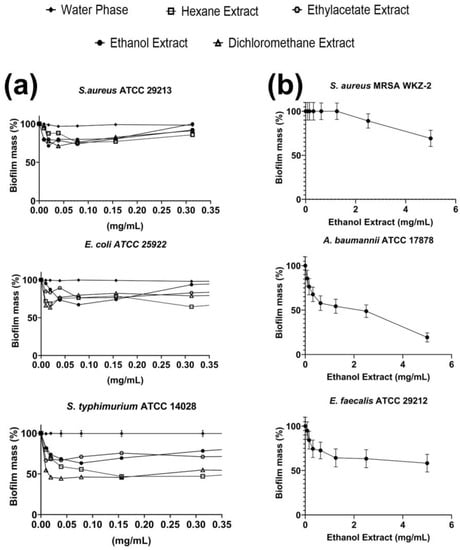 2.1. Antimicrobial and Antibiofilm Activity of E. foeminea Extracts
