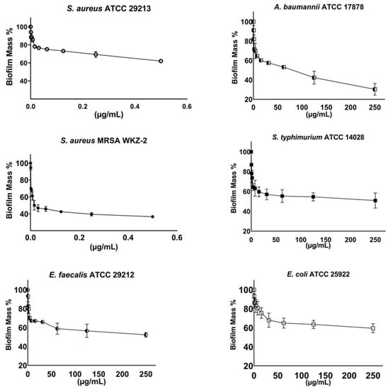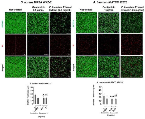 2.4. Evaluation of the Antibiofilm Activity of Kaempferol-3-O-α-L-(2″,4″-di-E-p-coumaroyl)-rhamnopyranoside (Compound 3)
