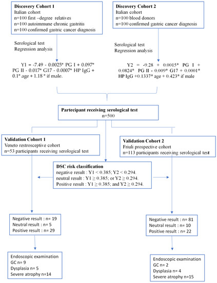Based on our earlier study [24] and two new datasets in this work, first (the discovery part), we developed a model—herein called the DeRe–Steffan–Cannizzaro (DSC) test—to discriminate patients at risk of developing GC. Briefly, the model is based on regression analyses to calculate the coefficient of the patient’s age and sex and their PG, anti-H. Pylori immunoglobulin (IgG), and serum gastrin G17 levels.