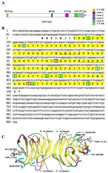 The homologous analysis of amino acid sequences was conducted using the Clustal Omega (https://www.ebi.ac.uk/Tools/msa/clustalo/ (accessed on 15 August 2020)). The conserved domains of NaGal-1 were identified using SMART (http://smart.embl-heidelberg.de/smart/set_mode.cgi?NORMAL=1 (accessed on 25 August 2020)). The tertiary structure and signal peptides were predicted by SWISS-MODEL (http://swissmodel.expasy.org/interactive (accessed on 7 October 2020)) and SignaIP program (http://www.cbs.dtu.dk/services/SignalP/ (accessed on 27 October 2020)), respectively. Phylogenetic tree was constructed by maximum-likelihood method at MEGA 6.06.