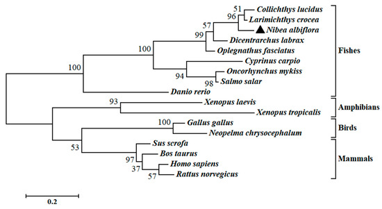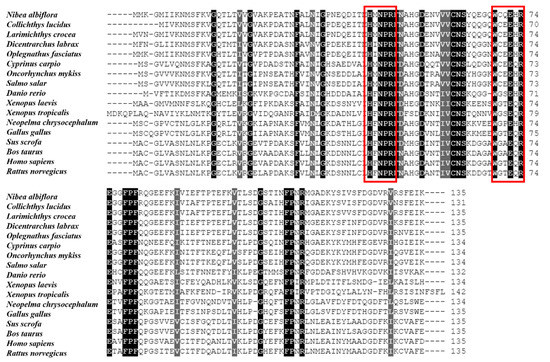 Young N. albiflora (3.28 ± 1.71 g) collected from Ningde City (Fujian Province, China). The cultivation and infection of N. albiflora with V. harveyi were carried out according to a previously described protocol [36]. In order to examine the distribution of NaGal-1 mRNA, twelve tissues including brain, heart, swim-bladder, kidney, liver, skin, gill, stomach, head-kidney, spleen, intestine, and muscle were collected from six healthy N. albiflora. In addition, the V. harveyi infection was carried out for studying the innate immune response of NaGal-1 during the V. harveyi infection. After 6 h, 12 h, 24 h, 48 h, 72 h, and 96 h of the V. harveyi infection, samples from brain, head-kidney, liver, and spleen were collected and all the collected tissues were frozen by liquid nitrogen and stored in −80 °C for further analysis.