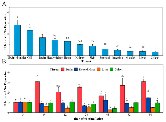 Relative mRNA expression of NaGal-1 (A) in twelve tissues of N. albiflora, and (B) after V. harveyi infection in brain, head kidney, liver, and spleen. The letters a, b, c, d, and e denote statistical significance (p < 0.05). The same letter indicates no significant differences (p > 0.05), adjacent letters indicate significant differences (p < 0.05), separated letters indicate a significant difference (p < 0.01).