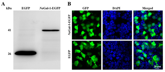 Expression of NaGal-1 in HEK 293T Cells. (A) Western blot of NaGal-1-EGFP (41.26 kDa) compared with control EGFP (26 kDa), and (B) Expression of NaGal-1-EGFP in HEK 293T cells was found in both cytoplasm and nucleus observed under the confocal fluorescence microscopy.