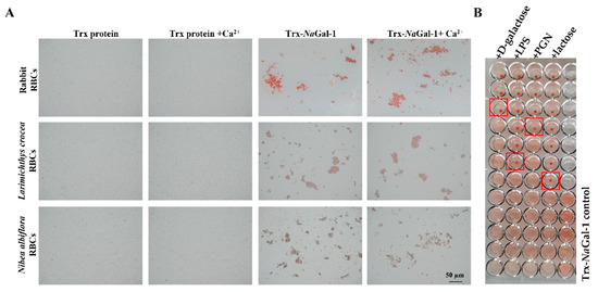 We performed a hemagglutination test of the purified recombinant protein, and the results showed that the purified Trx-NaGal-1 protein could agglutinate red blood cells (RBCs) from rabbit, L. crocea, and N. albiflora, and the RBC agglutination efficiency was not influenced by the addition of Ca2+. No RBC agglutination was observed in Trx protein control groups under the same conditions (Figure 7A).