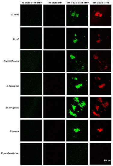 Bacterial agglutination and antibacterial activity of Trx-NaGal-1 protein. Agglutinated and dead bacteria: E. tarda, E. coli, P. phosphoreum, A. hydrophila, P. aeruginosa, and A. veronii, and non-agglutinated bacteria representative: V. parahemolyticus. All the bacteria stained by SYTO 9 were in green and dead bacteria stained by propidium iodide (PI) were in red.