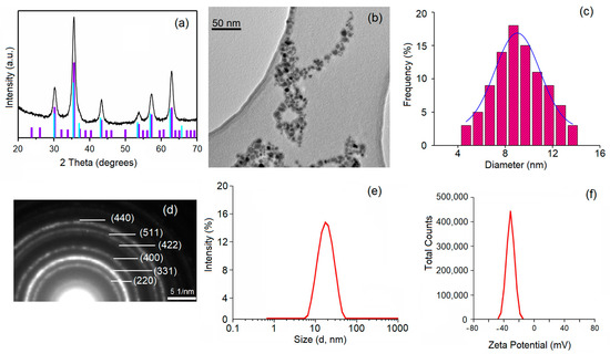 The DIO-NP particle size distribution histogram was conducted after measuring the mean diameter (DTEM) of approximately 500 particles. The average size of the DIO-NPs was 8.9 ± 1.5 nm (Figure 1c). The sizes of the particles counted to obtain the distribution were between 4 and 14 nm. The selected area electron diffraction (SAED) pattern is presented in Figure 1d. The SAED pattern of the synthesized DIO-NP presented in Figure 1d was indexed by a cubic maghemite (PCPDF#872334). The diffraction rings revealed were attributed to the (220), (311), (400), (422), (511), and (440) planes. The rings observed were in good accordance with the XRD pattern.
