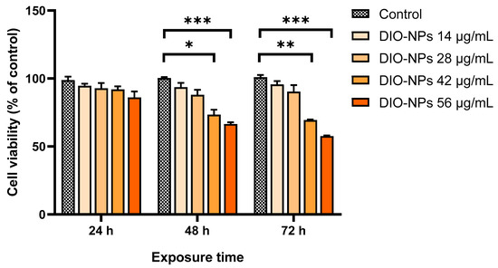 Cell viability of PANC-1 cells after exposure to different concentrations (14, 28, 42, and 56 μg/mL) of DIO-NPs for 24, 48, and 72 h. Data (n = 3) are expressed as percentages related to control ± SD. The results were considered statistically significant at * p < 0.05, ** p < 0.01, and *** p < 0.001 (sample vs. control).