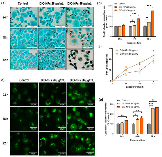 DAB-enhanced Prussian blue stain (Figure 3a) showed a dose and time-dependent accumulation of iron deposits (brown color) in the cytoplasm of PANC-1 cells (light blue color) after incubation with DIO-NPs. Exposure to the non-toxic concentration of DIO-NPs (28 μg/mL) led to a slight iron uptake in PANC-1 cells after 48 h, but the number of iron clusters visibly increased after 72 h, being localized mostly around the nucleus and possibly inside endocytic vesicles such as lysosomes. Moreover, in cells incubated with the cytotoxic concentration of DIO-NPs (56 μg/mL), iron loading was observed starting with 24 h of exposure and increased to 72 h when almost the entire cell cytoplasm and the nucleus appeared to be covered in brown iron deposits. Additionally, a decrease in cell density was observed after incubation with 56 μg/mL of DIO-NPs beginning from 48 h, thus confirming the MTT assay results.