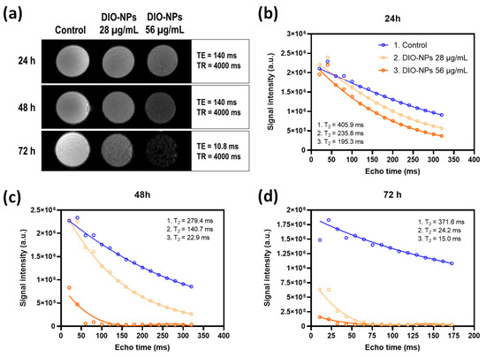 Figure 4 shows the imaging contrast (T2-weighted imaging) of samples containing PANC-1 cells exposed to DIO-NPs at concentrations of 0, 28, and 56 μg/mL iron for 24, 48, and 72 h. To measure T2, a multi-slice multi-echo sequence was used with a repetition time (TR) of 4000 ms. The echo time (TE) was increased in 15 equal steps from 20 ms to 320 ms for 24 h and 48 h time exposure intervals (Figure 4b,c), and from 10.8 to 172.57 for 72 h. The MRI images shown in Figure 4a were recorded at TE of 140, 140, and 10.8 ms, respectively. The enhanced cellular uptake of DIO-NPs (at both doses) resulted in the darkening effect of MR images compared to the control cells. The strongest T2 contrast (dark contrast) was obtained in cells incubated with the highest dose of DIO-NPs (56 μg/mL) for 72 h (Figure 4d). The MRI contrast of the DIO-NPs in PANC-1 cells was determined by curve fitting of the signal intensity decay.