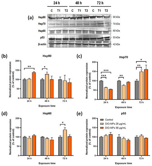 To gain a deeper understanding of their biological behavior in pancreatic cancer cells, we analyzed the effects of DIO-NPs on the protein expression of Hsp90, Hsp70, and Hsp60 as well as of p53. HSPs are a family of proteins of which expression on the transcriptional level is mainly induced by heat shock factor 1 (Hsf1), a master regulator of cells’ response to stressful conditions. They maintain protein homeostasis and can interact with multiple critical components of signaling pathways that regulate cell growth and development. Hsp90 particularly is a major therapeutic target for cancer because it protects numerous oncoproteins [57]. The significant increase in the Hsp90 protein level in the first 24 h of exposure to a concentration of 56 μg/mL of DIO-NPs might be the cause of a protective response of pancreatic cancer cells to stress induction. However, after 48 h, the protein level of Hsp90 returned to normal. Interestingly, exposure to a concentration of 28 μg/mL of DIO-NPs produced an upregulation of Hsp90 protein expression only after 48 h, which, most likely, is a defense mechanism of pancreatic cancer cells to ROS induction.