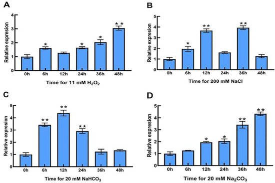 Expression characteristics of LpPsbP gene in the leaves of L. pumilum after stress treatment. The RNA in the leaves was extracted and then reverse-transcribed into cDNA and the levels of relative expression are gained through qRT-PCR. “*” indicates significant difference, Student’s t-test (P<0.05, ±SEM). “**” indicates extremely significant difference. (A): Expression of LpPsbP gene at 11 mM H2O2 treatment at different times. (B): Expression levels of LpPsbP gene at 200 mM NaCl treatment at different times. (C): Expression levels of LpPsbP gene at 20 mM NaHCO3 treatment at different times. (D): Expression levels of LpPsbP gene at 20 mM Na2CO3 treatment at different times.