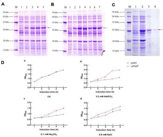 Protein induction experiment. (A): pGEX-LpPsbP induction at different IPTG concentrations (M: protein marker; 1, 2, 3, 4, 5: the expression of LpPsbP protein was induced by 0, 0.5, 1, 1.5, 2 mM IPTG); (B): pGEX-LpPsbP induction at different times (M: protein marker; 1, 2, 3, 4, 5, 6, 7: the expression of LpPsbP protein was induced for 0, 0.5, 1, 2, 3, 4, 5 h, respectively). (C): pGEX-LpPsbP protein purification using purification column with GST purification resin. M: protein marker; 1: induced without IPTG; 2: induced with 1 mM IPTG for 5 h; 3: pGEX-LpPsbP renatured protein; 4: pGEX-LpPsbP purified protein. (D): Growth curves of Escherichia coli under different Saline-Alkali stresses. a: The OD600 values of pGEX and LpPsbP induced for 5 h under untreated conditions (CK). b: The OD600 value of bacterial solution after 5 h induction by pGEX and LpPsbP under the treatment of 0.2 mM NaHCO3. c: The OD600 value of bacterial liquid after 5 h induction by pGEX and LpPsbP under the treatment of 0.1 mM Na2CO3. d: The OD600 value of bacterial solution after 5 h induction by pGEX and LpPsbP under the treatment of 0.8 mM NaCl.