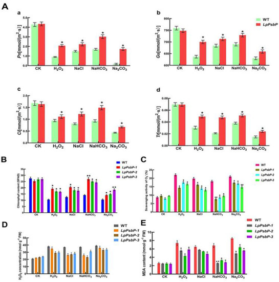 In order to study the resistance analysis of transgenic plants under salt stress, WT and transgenic tobacco plants with the same growth size in the pot were selected and irrigated with 20 mL of 1 M H2O2, 1 M NaCl, 0.5 M NaHCO3 and 0.5 M Na2CO3 solutions for 7 days. The growth phenotype (Figure 4D) was observed. Under 1 M H2O2 treatment, wild-type plants appeared to bend, while transgenic plants remained upright. Under the treatment of 1 M NaCl and 0.5 M NaHCO3, the plants had no tendency to bend but compared with the transgenic plants, the first to the fourth leaves of WT plants were drooping. Under 0.5 M Na2CO3 treatment, the leaves of wild-type and transgenic plants were drooping from bottom to top, compared with that of wild transgenic plants, which also demonstrated stem bending. The results show that LpPsbP transgenic plants were more tolerant to salt stress than WT plants.