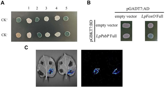 For further verification, pGADT7 and LpFoxO plasmids with added restriction site were digested with BamH1 and Xho1, and pGADT7-LpFoxO was successfully constructed. The strains cotransformed with pGBKT7-LpPsbP and pGADT7-LpFoxO could grow blue colonies on SD-Trp-Leu-His plus X-α-gal medium, while there were no blue colonies growth in the control group (Figure 6B). These results indicate that LpPsbP and LpFoxO proteins can interact with each other.