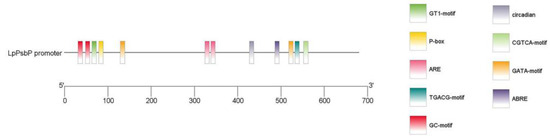 Through three rounds of PCR amplification by the chromosome walking method, a 680 bp fragment was cloned. The cis-acting element of the LpPsbP promoter sequence was analyzed using PlantCARE (shown in Table 3). Then, the TBtools software (Guangzhou, China) was used to carry out a visual analysis of the obtained promoter sequences (Figure 7). The analysis of sequence indicated that this sequence contained multiple regulatory and responsive sites.