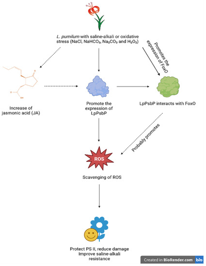 Concluded mechanism of how LpPsbP improves Saline-Alkali resistance in L. pumilum. After Saline-Alkaline stress and oxidative stress (caused by NaCl, NaHCO3, Na2CO3 and H2O2), L. pumilum creates ROS at a variety of locations, including chloroplasts. The sub-site of ROS generation in chloroplasts is mostly at the center of the oxygen-releasing complex. When encountering these stresses, the expression of LpPsbP is promoted. Then, LpPsbP will scavenge ROS, which means it will finally safeguard the PS II of L. pumilum, lessen damage to it, and therefore increase the ability of plants to tolerate stress. Moreover, we have made two additional speculations: 1. Following stress, L. pumilum generates more JA, which directly promotes the expression of the PsbP gene. 2. First comes with the fact that the FoxO gene will express itself more when ROS are created, which means that L. pumilum encounters these two kinds of stress. Then, because these two ROS scavenging proteins (LpPsbP and FoxO) can interact with each other, it will promote the scavenging of ROS, leading to a better protection and resistance. This figure is made using BioRender website (https://biorender.com/), dashed lines in this figure means these are speculations instead of definitive knowledge.