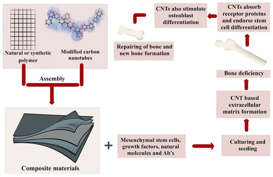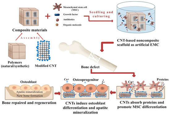 The fabrication process of carbon nanotubes and their roles in bone regeneration.