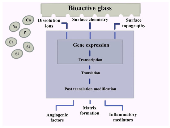 Nanocomposites were made using cerium oxide nanoparticles and scanned with an electron microscope, and spectroscopically and mechanically tested. The scaffolds’ pro-osteogenic character was assessed using a pre-osteoblast cell line’s adhesion, viability, and mineralization. Free radical scavenging (FRS) was assessed by measuring the breakdown of hydrogen peroxide and the cytotoxicity of cells on the scaffolds following oxidative stress induction. These studies confirmed the nanocomposites’ porosity, structural, and chemical characteristics. With no additional mineralization-inducing stimuli, the scaffolds demonstrated biocompatibility by improving cell adhesion, survival, and initiation [26]. Cells were combined with chitosan–gelatin polymers to create bone-healing bio-nanocomposite scaffolds. The scaffolds’ bioactivity was tested in simulated bodily fluids and with dental pulp stem cells. This study investigated the scaffold materials’ bone regeneration capabilities in vivo in rats. In vitro, the scaffold nanocomposites accelerated the crystallization of bone-like apatite. The alkaline phosphatase activity of bio-nanocomposites containing bioactive glass nanoparticles was increased [27]. Figure 2 shows the structure of bioactive glass. The figure shows that bioactive glasses have been shown to change gene expression in both hard and soft tissue repair. By changing the surface chemistry, topography, and release of dissolution ions, new resorbable bioactive glass constructs can change gene expression. This will make it possible to make tissue-specific scaffolds with specific surface chemistry, topography, and rate of ion release.