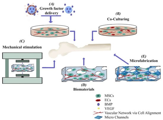 A gelatin–chitosan polymeric membrane with hydroxyapatite and titania nanoparticles has been developed, both of which are osteoconductive materials. The nanocomposite membrane was cross-linked using non-toxic ultraviolet (UV) radiation to increase its thermophysical and mechanical properties and manage its biodegradability. Cell adhesion and proliferation experiments were used to assess the novel nanocomposite’s in vitro biocompatibility. Using mouse embryonic fibroblast (MEF) cells, osteoconductivity was assessed [88]. The bone regeneration process with the contribution of biomaterials is shown in Figure 5. The figure shows that different methods have been used to induce vascular networks formation in engineered constructs for bone regeneration. These include providing growth factors, using coculturing systems, applying mechanical stimulation, using biomaterials with the right properties, and using microfabrication techniques.