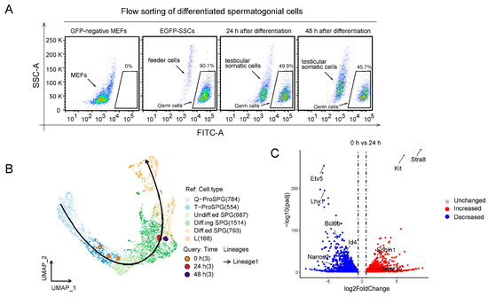 We next sorted SSCs at different stages of culture using flow cytometry for RNA-seq analysis (Figure 2A). To determine the stage of SSC differentiation, we first compared our RNA-seq data with reported single-cell sequencing data [8,10]. This revealed that the EGFP-SSCs were consistent with the transitional prospermatogonia stage (T-Pro SPG). Following a 24 h differentiation, they were at the differentiating spermatogonia stage (Diff.ing SPG). Lastly, after 48 h of co-culture, the EGFP-positive cells were closer to differentiated spermatogonia (Diff.ed SPG). To better illustrate the conclusion, we used two datasets from published works for comparison [9,11]. We found the SSCs differentiated for 48 h were in the differentiating spermatogonial stage, specifically in S-phase Type B spermatogonia, while 0-h SSCs were in the Type A spermatogonia stage (Figure S2A,B). These patterns were also consistent with the spermatogonia differentiation trajectory in vivo (Figure 2B). Based on the RNA-seq results, we obtained a total of 4647 differentially expressed genes between 0 h and 24 h, including 2017 upregulated genes and 2630 down-regulated genes, and also 5917 differentially expressed genes between 0 h and 48 h, including 2527 upregulated genes and 3390 down-regulated genes (Table S4). The SSC differentiation markers Stra8 and Kit were dramatically upregulated after 24 and 48 h of co-culture in vitro. However, the expressions of prospermatogonial stem cell-specific markers Etv5, Lhx1, Bcl6b [12], and stem cell-specific marker Oct4, Nanos2 were significantly downregulated, relative to SSCs (Figure 2C,D). The clustering heat map also revealed that the levels of SSC-specific markers Zbtb16, Gfra1, and Lin28a decreased significantly from 0 to 48 h, whereas the contents of the meiotic stage biomarkers, namely, Rec8, Dmc1, and Sycp3 continued to rise (Figure 2D,E). Likewise, using GO enrichment analysis, we revealed that the functional terms of early SSC differentiation, including stem cell differentiation and germ cell development, were significantly upregulated between 24 and 48 h, indicating that our co-culture system initiated the SSC differentiation process (Figure 2F,H). Moreover, we noticed that stem cell proliferation-related GO, such as stem cell population maintenance, regulation of MAP kinase activity [13], and regulation of cell growth, were markedly downregulated during this process. Together, these results indicated that SSCs were induced to differentiate in vitro, as was evidenced by the meiosis-induced alterations in gene expression and morphology.