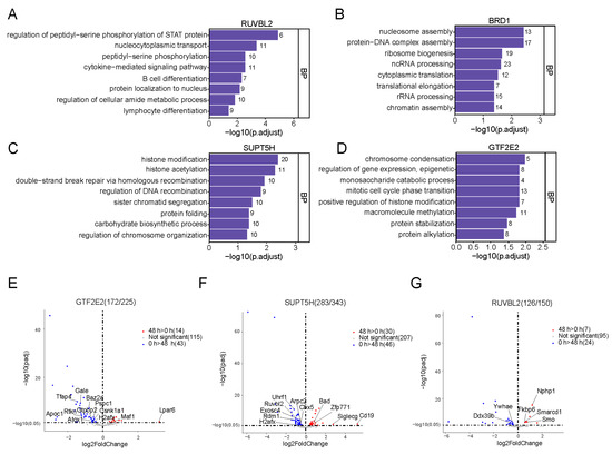 Among these eight TFs, four TFs exhibited relatively high protein levels. Hence, we selected these four TFs for further analysis. We first analyzed the GO of the target genes (downloaded from the CISTROME Database) associated with these four TFs. Based on the GO terms analysis, enrichments were mainly in protein modification (HM, histone acetylation, peptidyl-serine phosphorylation), cell differentiation (B cell differentiation, lymphocyte differentiation), cell cycle phase transition, and regulation of gene expression (Figure 4A–D). These results demonstrated that the transition process from prospermatogonia to differentiated spermatogonia essentially utilized HMs, namely H3K9me2 and H3S10ph. Moreover, their roles may be transmitted using TFs, such as GTF2E2, SUPT5H, BRD1, and RUVBL2. To elucidate whether the target genes associated with these four TFs also demonstrated significant alterations in our RNA-sequencing data, we mapped these target genes to our RNA-sequencing data. Red and blue dots represented highly- and scarcely-expressed genes at 48 h, respectively (Figure 4E–H). We also revealed that the genes with relatively high expression at 0 h were primarily related to cell growth and proliferation, particularly cancer cell proliferation, such as Tfap4 [17], Rdm1 [18], Ddx39b [19], Pgam1 [20], and so on. Some of the highly expressed genes at 48 h were related to growth inhibition and differentiation, such as Maf1 [21], Zfp771 [22], Smarcd1 [23], Hoxb4 [24], and so on (Figure 4E). Lastly, we also revealed that the TF GTF2E2, which was pulled down by both H3K9me2 and H3S10ph, interacted with Stra8 [25], and Stra8 served essential modulatory roles in the initiation of SSC differentiation (Figure 4I). Therefore, we hypothesized that these TFs, particularly GTF2E2, regulate SSC differentiation by transmitting HM functions.
