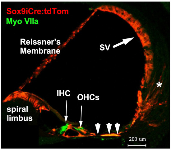 Cre recombinase activity was assessed in the mouse cochlea. Transgenic mice produced to carry a BAC clone containing the promoter region of the Sox9 gene and an ERT2 inducible Cre recombinase were bred with the Ai14 tdTomato mouse line. Tamoxifen treatment activates the Cre recombinase that then removes the stop codons in front of the tdTomato reporter sequence. All cells with tamoxifen-activated Cre recombinase then express the red fluorescent tdTomato reporter gene. In the adult cochlea, cells that harbor activatable Cre recombinase include interdental cells and inner sulcus cells (poorly visible here) of the spiral limbus, pillar cells and Deiter’s cells, supporting cells lateral to the outer hair cells (arrowheads), cells of the spiral prominence, cells of the stria vascularis (SV, large arrow), and a scattering of Type II fibrocytes of the spiral ligament (asterisk).