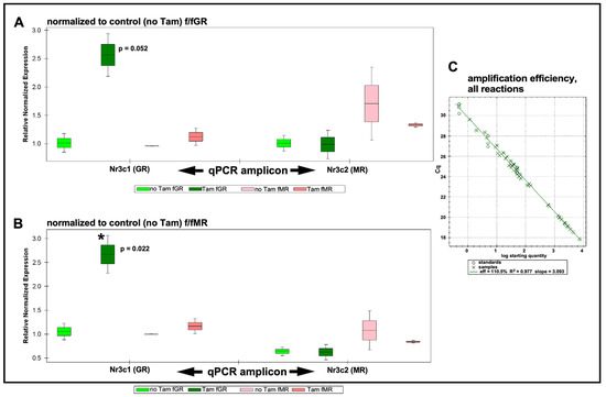 qRT-PCR results. Expression levels are grouped by target gene as assessed in each mouse line and with either the GR or MR serving as normalizer. (A) qRT-PCR results are normalized to the control (no tamoxifen) expression level of GR. Following tamoxifen treatment, Nr3c1 (GR) expression (green bars) is increased approximately 2.6×. When normalizing to GR this trend lies just outside standard statistical significance (p = 0.052), but when normalizing to MR, this increased GR expression is significant (p = 0.022). Expression of Nr3c2 is slightly elevated (pink bars) when normalized to Nr3c1 control (no tamoxifen). Expression of Nr3c2 is slightly (approximately 16%) decreased following tamoxifen treatment. No change was observed in Nr3c1 expression level under these conditions. (B) Similar trends as described when normalizing results to Nr3c1 in (A) were observed when normalizing data to Nr3c2. Up-regulation of Nr3c1 was statistically significant (asterisk). (C) The amplification efficiency for all sample reactions (X symbols), including reference genes (circles), is plotted. Average amplification efficiency was 110.5%. See Supplementary Materials Figures S4 and S5 for PCR subject group design and analysis plots of individual biological repeats. Boxes indicate mean with upper and lower quartiles; whiskers indicate SEM.