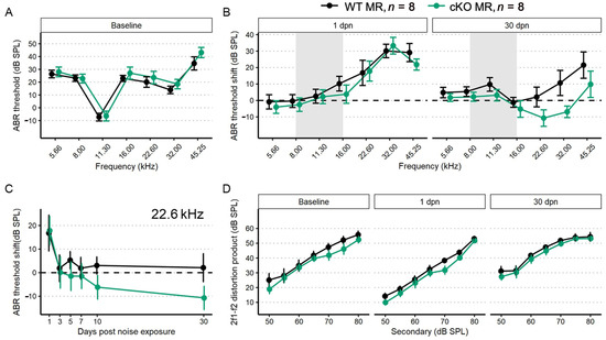 ABR threshold and DP amplitudes (mean ± SEM) from five-month-old mice (n = 8 each group) after supporting cell MR ablation and 100 dB SPL mild noise exposure. (A) Baseline ABR threshold frequency tuning curve. Data from cKO MR mice are green. Ablation of MR did not result in a significant change to baseline thresholds. (B) ABR threshold shift plots for 1 and 30 dpn. A threshold shift of zero indicates a full return to pre-noise threshold and would be indicated by a plot along the dashed line. While at 1 dpn there was no difference in threshold shift between MR control (no tamoxifen) and cKO mice, by 30 dpn, cKO mice demonstrated a trend toward more sensitive ABR thresholds at frequencies mapped basal of the region directly impacted by noise. (C) ABR threshold shift at 22.6 kHz plotted against days post noise exposure clearly demonstrates the temporal dynamics leading to increased threshold sensitivity. (D) DP amplitudes with f2 = 22.6 kHz sound stimulus at baseline, 1, and 30 dpn did not change between groups, suggesting that changes in mechanics of the basilar membrane may not produce the increased threshold sensitivity shown in (B,C). Two-way ANOVA tests were used for statistical assessments with statistical significance assigned to p < 0.05.