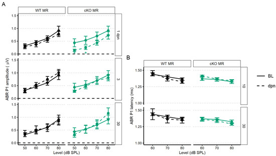 To illustrate recovery dynamics from the 100 dB SPL 8–16 kHz octave band noise exposure, we examined the response properties at 22.6 kHz further (Figure 3C). The 22.6 kHz region shows the highest 1 dpn temporary threshold shift and the most dramatic recovery by 30 dpn. Mouse auditory function at 22.6 kHz is relatively sensitive and the half-octave shift phenomenon defines the 22.6 kHz frequency region as the most vulnerable to the 8–16 kHz noise band [49]. Recovery dynamics were virtually identical between control (no tamoxifen) and cKO mice for the first 3 days. Temporary threshold shifts maximally recovered within the first 3 dpn, indicated by the plateau of threshold shift from 5 to 30 dpn. In the MR cKO mice, recovery continued beyond 3 dpn, hitting the baseline value at 5 dpn (control (no tamoxifen) mice never recovered to baseline), remained at approximately the same recovery level through 7 dpn, then underwent an apparent second phase of “enhanced recovery” between 7 and 10 dpn and again further improving between 10 and 30 dpn, hitting a re-established threshold of 10 dB SPL better (more sensitive) than baseline. No plateau was recorded for recovery of the MR cKO 22.6 kHz ABR threshold because the experiment was terminated at 30 dpn. While these data indicated a strong trend for a differential recovery of ABR thresholds between groups, strict statistical significance was not attained. There were no classical outlier data points that could force the data away from statistical significance and variance was similar between groups. The 2f1–f2 distortion product otoacoustic emission with f2 = 22.6 kHz was not statistically different between control (no tamoxifen) and cKO MR mice at baseline or at either 1 dpn or 30 dpn (Figure 3D) as would be expected for the relatively mild noise exposure. Because the 22.6 kHz frequency region is vulnerable to 8–16 kHz noise band, we analyzed this frequency more extensively to assess noise-induced effects. We explored the ABR P1 amplitude and latency to further assess whether MR plays a role in modulating afferent activity following noise exposure.