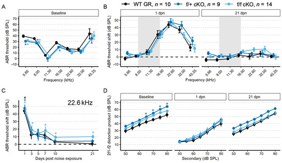 Glucocorticoids are implicated in modulation of auditory sensitivity. Adrenalectomy, synthetic GCs, and stress exposure can each alter auditory sensitivity [13]. Here, cKO of Sox9+-supporting cell GR expression of either one (f/+ mice) or both (f/f mice) alleles induced lower baseline ABR thresholds, especially of low frequencies. These changes to auditory afferent sensitivity are presumably related to greater otoacoustic emission amplitudes across frequencies similar to that produced by f2 = 22.6 kHz and 50–80 dB SPL. Our analysis of noise exposure focused on the 22.6 kHz region because this region is simultaneously sensitive (so it has a low threshold and thus maximal range for quantifying threshold shifts before any ceiling effect truncates data collection) and is one of the most affected regions following exposure to an 8–16 kHz noise band. The 22.6 kHz region is therefore useful for detecting degradation of auditory thresholds after noise-induced damage. While in control (no tamoxifen) and f/f cKO GR mice, DP amplitudes recovered by 21 dpn, the DP amplitudes of f/+ heterozygous cKO GR mice did not recover. ABR thresholds and P1 amplitudes recovered to wild-type values for both control (no tamoxifen) and f/+ heterozygous cKO GR mice. However, the f/f cKO GR mice never regained baseline ABR threshold sensitivity or P1 amplitudes. GR-related physiological vulnerability of f/f cKO GR mice did not relate to increased auditory sensitivity. Indeed, similar ABR threshold shift across groups at 1 dpn (see Figure 6B) suggests that the degree of noise induced dysfunction was not related to an increased initial threshold shift [96] and thus any change in dynamic recovery between the GR mouse lines is not explained by an initially greater vulnerability to noise-induced damage. Overall, though we have targeted a range of supporting cell types, an effect on auditory sensitivity could be through Deiter’s cell modulation of outer hair cell electromotility [97] but appeared independent of vulnerability to noise exposure.