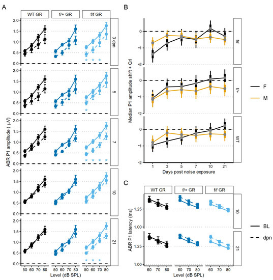 We next sought to investigate potential sex effects related to GR functionality. We modeled sex effects on 80 dB sound stimulus-driven 22.6 kHz ABR P1 amplitudes using a Bayesian inferential framework to improve detection of mild injury types [52]. Sex differences were supported for the f/f cKO GR noise-vulnerable group. Specifically, male mice had less P1 reduction at 1 dpn compared to the females (Bayes Factor [BF10] = 3.2), but there was evidence to support a moderate P1 amplitude decrease at 21 dpn in male mice when compared to baseline (BF10 = 4.4, 95% CrI = −0.85 to −0.16) (Figure 6B, 0 value = dashed line). In contrast, at 21 dpn, female f/f cKO GR mice have P1 amplitude shift intervals which overlap zero (BF10 = 0.4, 95% credible interval [CrI] = −0.8 to 0.2). While support was diminished for f/+ heterozygous cKO GR male mice, credible intervals suggest relatively greater support for P1 amplitude loss (BF10 = 0.9, 95% CrI = −0.96 to −0.02). For control (no tamoxifen) GR male mice, credible intervals suggest near complete recovery of P1 amplitudes (BF10 = 0.4, 95% CrI = −0.71 to 0.1). GR-related male noise vulnerability is consistent with reports of male susceptibility to sensory and neural hearing losses compared to noise susceptibility of females [53,54,55].