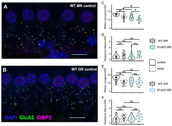 Next, we assessed ribbon synapse counts and orphaned ribbon counts per inner hair cell as a morphological correlate of afferent synaptopathy. C-terminal binding protein 2 (CtBP2) is a constitutive protein of the presynaptic “ribbon” release site in photoreceptor cells and hair cells and some specialized neurons within the brain. The glutamate receptor AMPA subunit 2 (GluA2) controls calcium permeability through AMPA-responsive glutamate receptors and is present in all adult AMPA glutamate receptor patches on SGN dendrites [56]. Paired (directly opposing) CtBP2-GluA2 immunolabelled patches are indicative of a functional afferent synapse between the hair cells and ganglion cells. We immunostained cochlear whole mount tissue of f/f MR control (no tamoxifen) mice (without noise: n = 3 mice [2 males; 1 female] and plus noise: n = 5 mice [2 males; 3 females]) and f/f MR cKO mice (without noise: n = 4 mice [4 males] and plus noise: n = 4 mice [4 males]) (Figure 7A) with antibodies to CtBP2 and GluA2 (Figure 7A,B) and then counted CtBP2-GluA2 pairings as a measure of afferent synapse integrity (Figure 7C,D). We chose the 22.6 kHz cochlear region for analysis because this region is predicted to be one of the most affected by an 8–16 kHz noise band [49,57,58,59] and is ideal to assess noise-induced damage. We analyzed the average number of synapses per image with a linear mixed-effects model. We identified a significant effect of noise as driving ribbon synapse loss in control (no tamoxifen) MR mice. In cKO mice, in which supporting cell MR was ablated, ribbon synapse numbers were decreased even prior to noise (Figure 7C). The median number of averaged CtBP2-GluA2 opposed profiles was 12 per IHC, roughly similar to the median number of intact synapses of control (no tamoxifen) mice that experienced the 2 h, 100 dB SPL sound exposure (13 per IHC). Interestingly, cKO MR mice experienced only marginally greater noise-induced ribbon synapse loss beyond that observed in the cKO mice that did not experience noise exposure (Figure 7C). Prior research has shown that orphaned ribbons, defined as CtBP2 profiles not opposed by postsynaptic GluA2 profiles, are increased immediately after noise exposure but are resolved by 7 dpn [60,61]. We examined afferent synapse integrity in mice that were recovered to at least 30 dpn, our experiment endpoint. Our analyses of orphaned ribbons at 30 dpn showed no differences among wild-type and cKO mice in both the noise-exposed and control animals (Figure 7D). In a similar manner, we analyzed ribbon synapses in fGR:Sox9iCre mice (control (no tamoxifen) without noise: n = 5 mice [3 males; 2 females], control (no tamoxifen) plus noise: n = 4 mice [2 males; 2 females], cKO without noise: n = 5 mice [3 males; 2 females], cKO plus noise: n = 6 [4 males; 2 females]) (Figure 7B,E,F) to asses noise-induced loss of ribbon synapses (afferent pre- and post-synaptic elements). Analysis of ribbon synapse counts revealed similar ribbon synapse vulnerability to mild 94 dB SPL noise exposure across control (no tamoxifen) and f/f cKO GR mice (Figure 7E). Noise-exposed control (no tamoxifen) GR mice had reduced ribbon synapse counts compared to age-matched control (no tamoxifen) no-noise. A trend was revealed in which noise-exposed cKO GR mice had reduced ribbon synapse counts relative to age-matched no-noise cKO GR mice. Additionally, a trend for cKO GR mice to have reduced ribbon synapse counts under basal conditions might have influenced the final results, producing a non-significant noise-induced ribbon synapse loss (Figure 7E). Neither noise nor expression status of GR in supporting cells altered counts of IHC orphaned ribbons (Figure 7F).