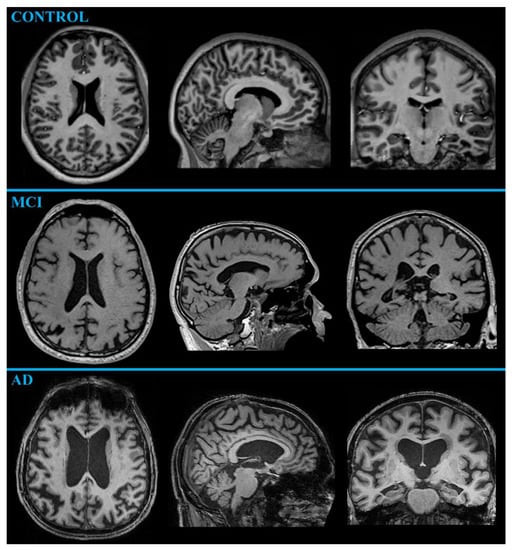 Example of MR neuroimaging (T1-weighted MRI at 3 Tesla MR-scanner) of a control subject (70-year-old female), of an MCI patient proceeding to AD in two years (72-year-old male), and of an AD patient (75-year-old female) in axial, sagittal, and coronal sections. The differences are visually subtle, but the increased atrophy in the medial temporal lobe and the enlarged ventricles are apparent in MRI.