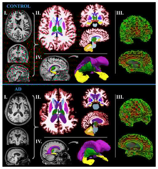 Example of MRI (I.; T1-weighted MRI at 3 Tesla MR-scanner) and MR-volumetric (II.; MR-volumetry performed on Freesurfer software) neuroimaging of a control subject (40-year-old female) and AD patient (42-year-old female) in axial, coronal, and sagittal sections. In AD, the apparent atrophy is shown across the white matter (III. 3D model of the whole brain) as well as in several brain structures (IV. 3D model of selected brain areas; atrophy of the hippocampus/yellow, atrophy of the thalamus/green, enlarged lateral ventricles/purple).