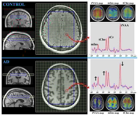 Example of 1H MRS neuroimaging (T1-weighted MRI at 3 Tesla MR-scanner) obtained by the multivoxel spectroscopy approach with the presented spectra (one selected voxel indicated with the red square and arrow) showing the main metabolite peaks: total creatine (tCr), total choline (tCho), total N-acetyl-aspartate (tNAA), and myo-Inositol (mIns). The 1H MRS spectra for a control subject (50-year-old female) and AD patient (55-year-old female) are depicted with the typical metabolic peak changes being indicated by black arrows (↓: decreased, ↑: increased). Metabolic maps of the brain tissue are also shown (tNAA, mIns, and tCho maps).