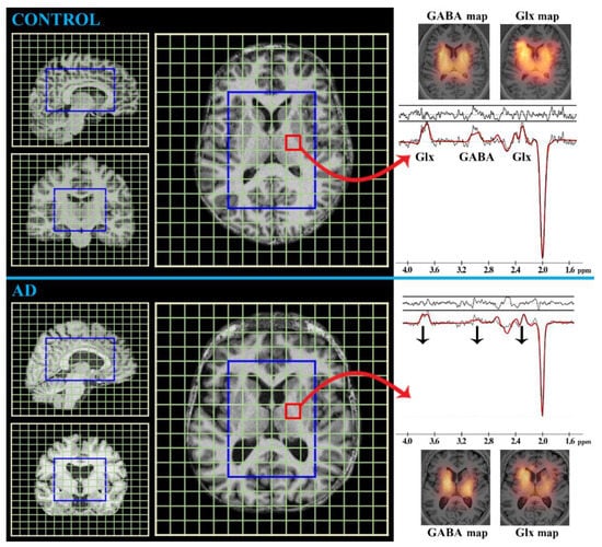 Example of 1H MRS neuroimaging (T1-weighted MRI at 3 Tesla MR-scanner) measured by the multivoxel Mescher–Garwood-editing MRS approach with the represented spectra (one selected voxel indicated with the red square and arrow) showing the main metabolite peaks: glutamate with glutamine (Glx) and γ-aminobutyric acid (GABA). The 1H MRS spectra for a control subject (35-year-old female) and AD patient (42-year-old female) are depicted with the typical metabolic peak changes being indicated by black arrows (↓: decreased, ↑: increased). Metabolic maps of the brain tissue are also shown (GABA and Glx maps).