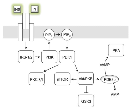 Insulin signaling pathway. Transmembrane structure depicts insulin receptor complex sensing insulin (INS) and neuritin (N; a member of the neurotrophic factor family, promotes neuritogenesis, neuronal survival, and synaptic maturation). Abbreviations: Akt/PKB, Akt protein kinase B; AMP, adenosine monophosphate; cAMP, cyclic adenosine monophosphate; GSK3, glycogen synthase kinase-3 β; IRS-1/2, insulin receptor substrate 1 and 2; mTOR, mammalian target of rapamycin; PDE3b, phosphodiesterase 3B; PDK1, phosphoinositide-dependent protein kinase 1; PI3K, phosphoinositide 3-kinase; PIP2, phosphatidylinositol 4,5-bisphosphate; PIP3, phosphatidylinositol (3,4,5)-trisphosphate; PKA, protein kinase A; PKC λ/ζ, protein kinase C λ/ζ.