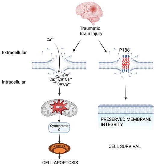 Schematic depicting how P188 mitigates TBI-induced cellular membrane permeability, thus preventing dysregulated calcium influx, reactive oxygen species (ROS) formation, and activation of apoptotic signaling cascades.