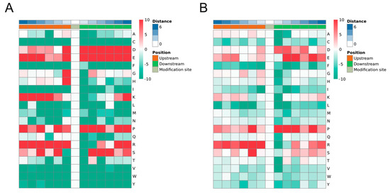 Figure 3. Motif analysis of phosphorylation sites. The motif enrichment heat map of upstream and downstream amino acids of all identified S (A) and T (B) modification sites. The red color represents significant enrichment of this amino acid near the modification site, and the green color represents a significant decrease in this amino acid near the modification site.