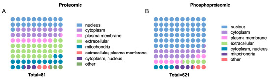 Subcellular localization analysis clarified the specific intracellular distribution of the DEPs and DEPPs (Figure 4A,B). The largest proportion of DEPs was located in the extracellular space. Other DEPs were very evenly distributed in the nucleus, cytoplasm, and mitochondria. The largest proportion of DEPPs is located in the nucleus, followed by the cytoplasm. In particular, 60% of DEPPs are nuclear-associated proteins, implying that phosphorylation regulation in the nucleus is an important aspect of GnRH regulation of FSH synthesis and secretion. In addition, there were a few DEPs and DEPPs located in the plasma membrane or other locations.