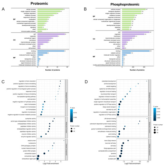 Figure 5. GO functional enrichment analysis of DEPs and DEPPs. (A,B) GO categories of the DEPs and DEPPs. (C,D) Bubble charts of enrichment distributions of DEPs (C) and DEPPs (D) in GO functional classification.