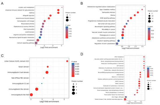 Figure 6. KEGG pathways and protein structural domain enrichment analysis of DEPs and DEPPs. (A,B) Bubble charts of enrichment distributions of DEPs (A) and DEPPs (B) in KEGG pathways. (C,D) Bubble charts of enrichment distributions of DEPs (C) and DEPPs (D) in protein domains.