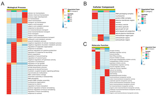 Figure 7. Cluster Analysis of DEPs based on GO classification. (A) Heat map for cluster analysis of DEPs based on the biological process module of GO classification. (B) Heat map for cluster analysis of DEPs based on the cellular component module of GO classification. (C) Heat map for cluster analysis of DEPs based on the molecular function module of GO classification.