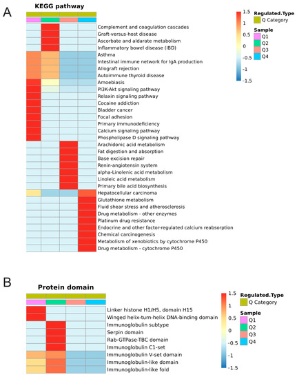 The differentially expressed and differentially phosphorylated modified proteins obtained from rat adenohypophysis tissues before and after GnRH treatment were classified into 4 categories according to their differential ploidy: Q1: proteins down-regulated more than 0.769-fold, Q2: proteins down-regulated between 0.769 and 0.833-fold, Q3: proteins up-regulated between 1.2 and 1.3-fold, and Q4: proteins up-regulated more than 1.3-fold. Additionally, the clustering analysis based on GO classification, KEGG pathway, and protein structural domain enrichment was done for the proteins in different Q classifications, respectively.