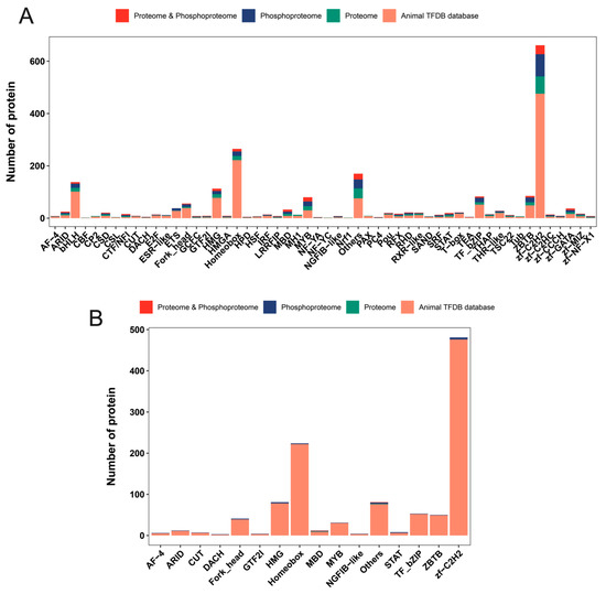 Figure 9. Distribution of transcription factor annotations in the two omics profiles and rat databases. (A) Overlap statistics between transcription factors in each transcription factor family and identified proteins in two omics (B) Overlap statistics between transcription factors in each transcription factor family and differentially expressed proteins in two omics.