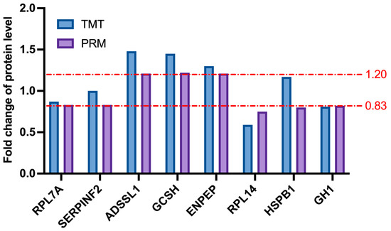 Figure 10. Expression patterns of selected differentially expressed proteins with PRM validation and TMT analysis. From top to bottom, the two dotted lines represent 1.2-fold and 0.83-fold, respectively.
