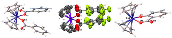 Molecular structure of titanocene (IV) dicarboxylates 2a (left), 2e (middle), and 2g (right) in representation of atoms by thermal ellipsoids (p = 50%).