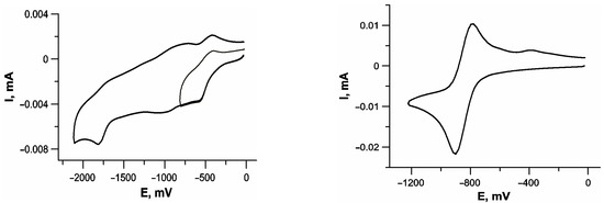 Cyclic Voltammetry experiments were conducted using an IPC Pro M potentiostat (Russia) with cyclic voltammetry (CV) and rotating disk electrode (RDE) techniques. Glass-carbon (d = 2 mm) disks were used as the working electrodes, 0.05 M Bu4NClO4 solution in DMF served as the supporting electrolyte, and Ag/AgCl/KCl (sat.) was used as the reference electrode. The potential scan rates were 100 mV/s. Samples were dissolved in the predeaerated solvent.